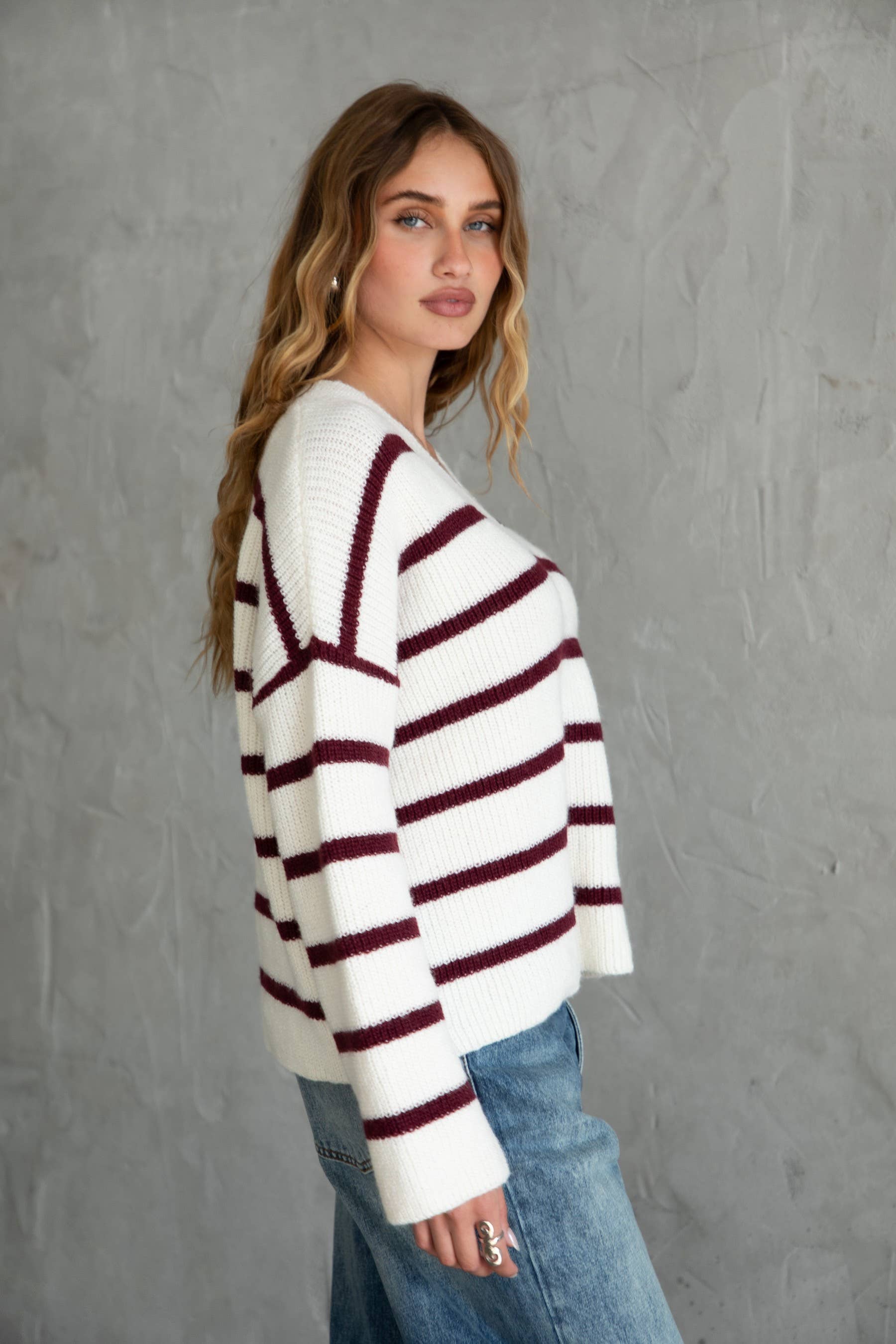 Experience the ultimate comfort and style with the Serena Stripe Sweater. Featuring a low V neckline and long, loose sleeves, this sweater offers a relaxed, boxy fit that is perfect for any occasion. The contrast of burgundy narrow stripes adds a pop of color to the classic yarn knit rib and stretch fabric design. Don't miss out on this must-have addition to your wardrobe!